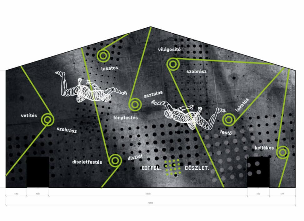 A karakteres felület látványvilága illeszkedik az Eiffel csarnok arculatához, megidézi a vas tartószerkezetek szegecseit, amelyek végigfutnak a kiállítás egyéb installációs elemein is.